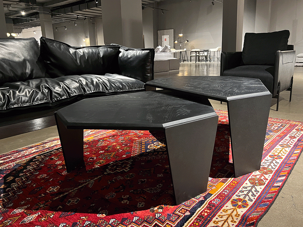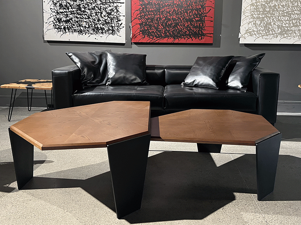 Previous Next Previous Next Penta Penta coffee table with black electrostatic iron sheet bases and walnut top ability to choose wood color.