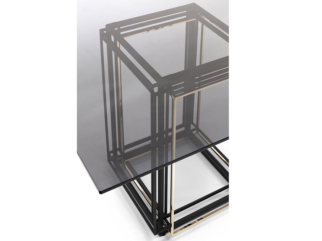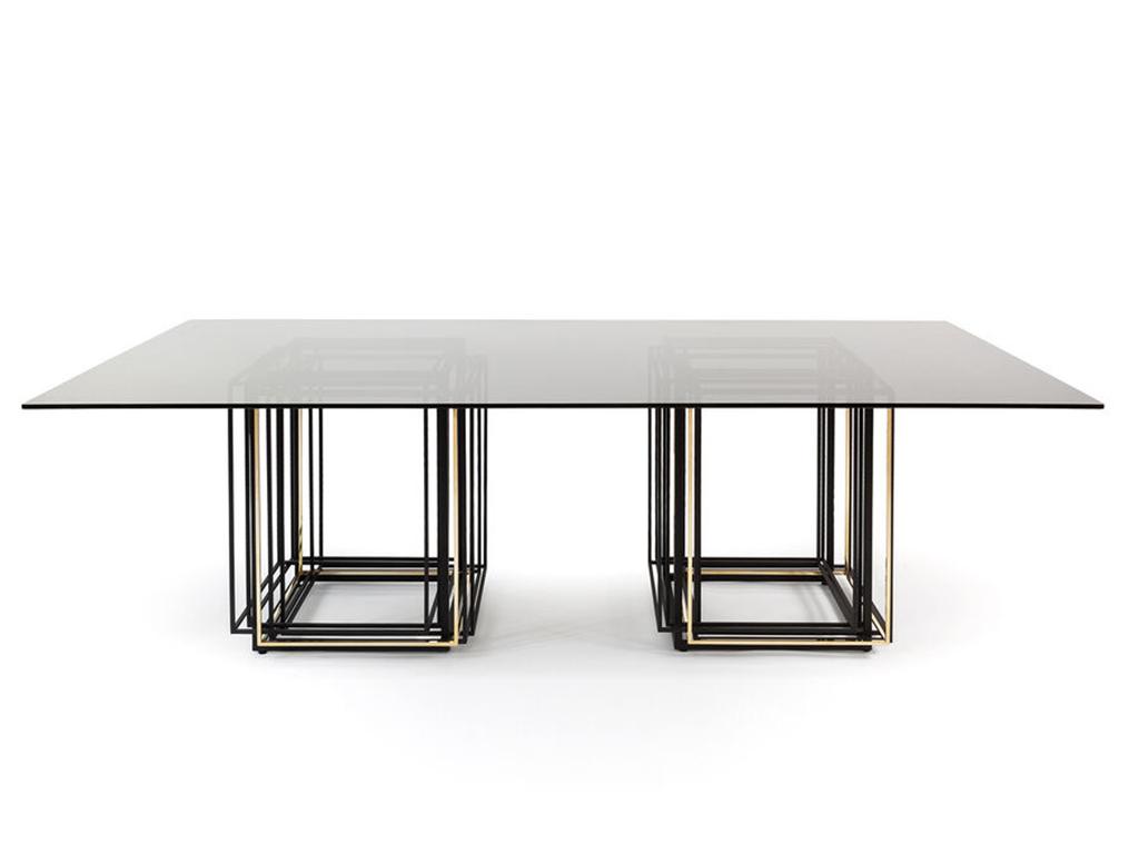 Previous Next Previous Next Mix Mix dining table with integrated legs made of iron-filled profile with black electrostatic color and full bronze profile and full glass top with the option of choosing the top with wood or stone material.