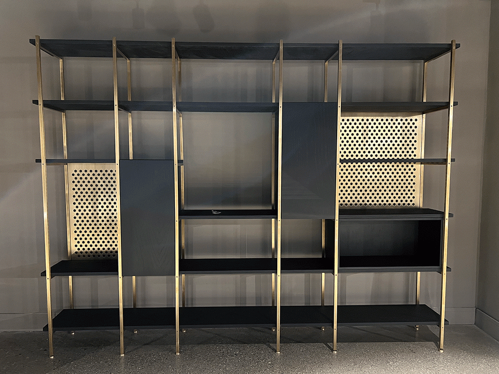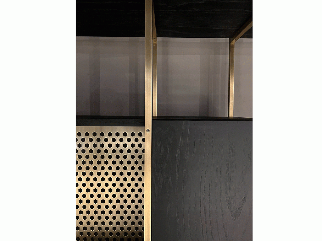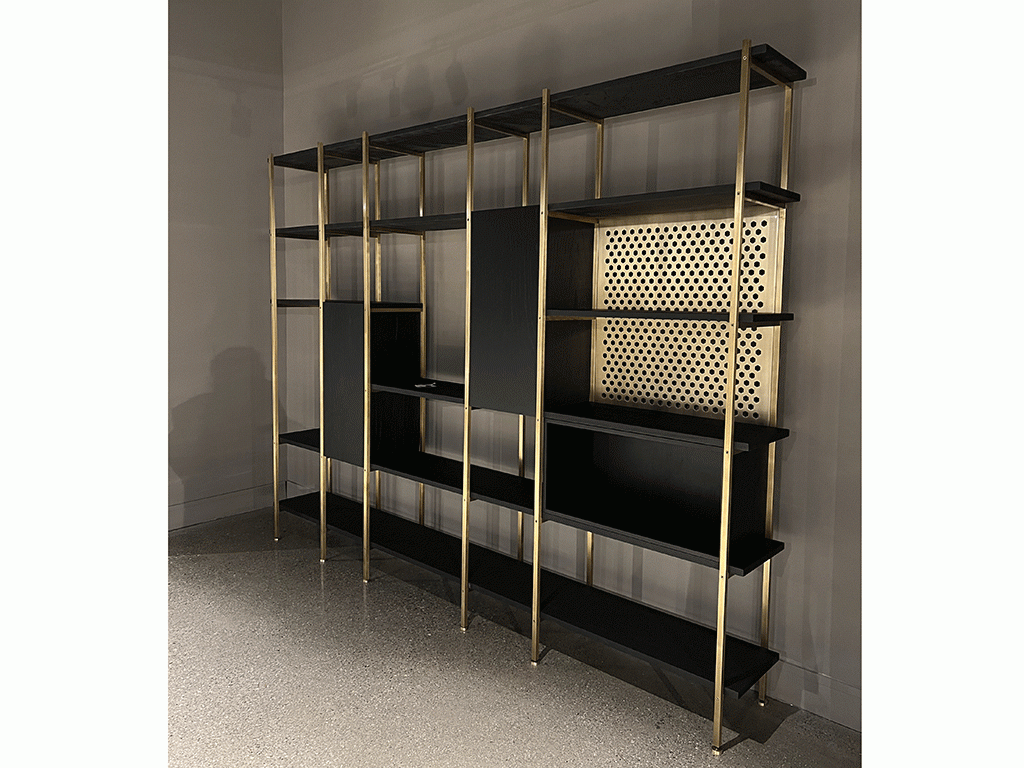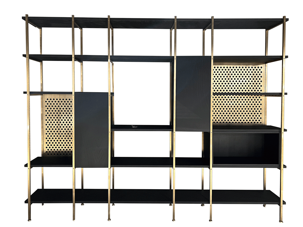 Liber full bronze shelf and library with oak veneered floors the ability to place a TV on its floors.