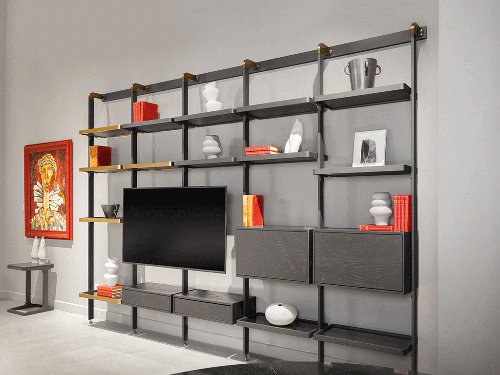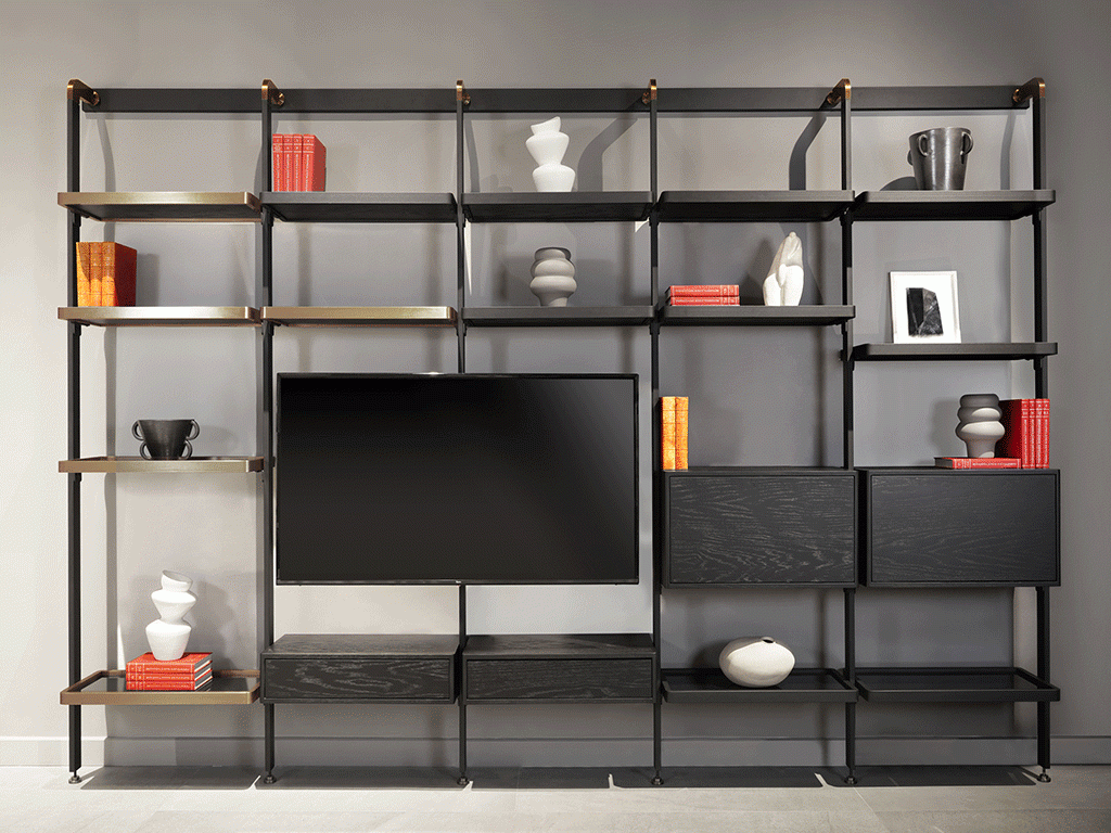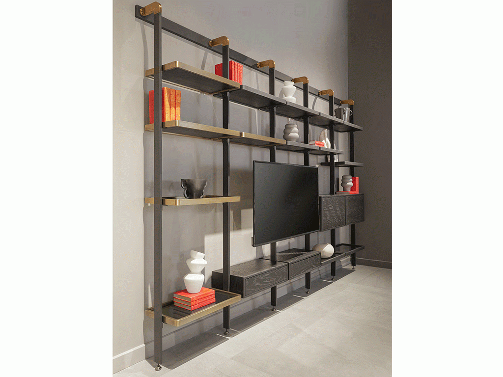 Multe bookcase and TV stand is a special and multi-material product with a modern design and a high variety of materials.The columns are made of metal profile with electrostatic color, the shelve floor is made of metal material with bronze plating and the bottom of black Lacobel glass, and all oak wood boxes and metal ingot package with bronze plating, the ability to order in desired dimensions .